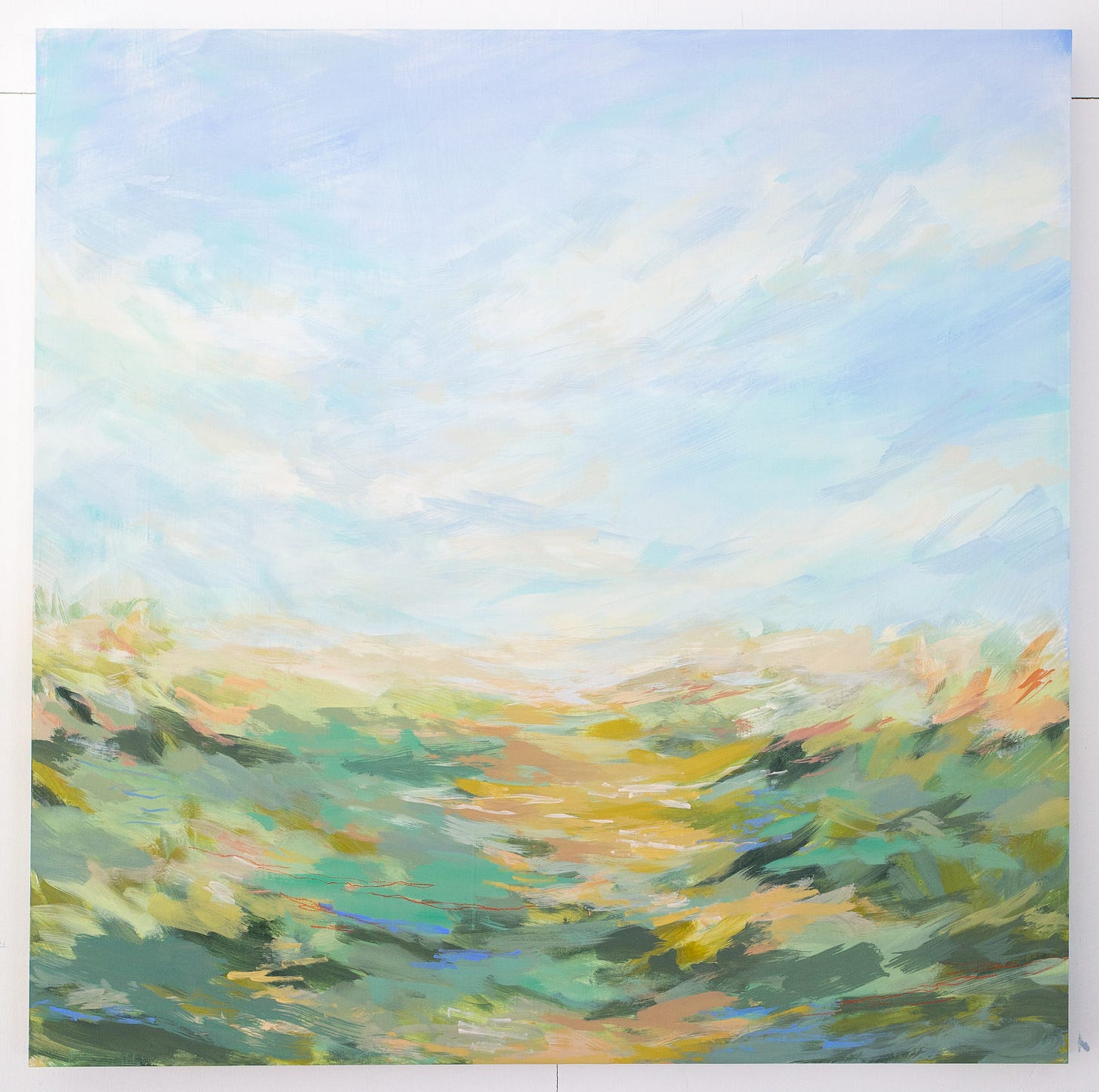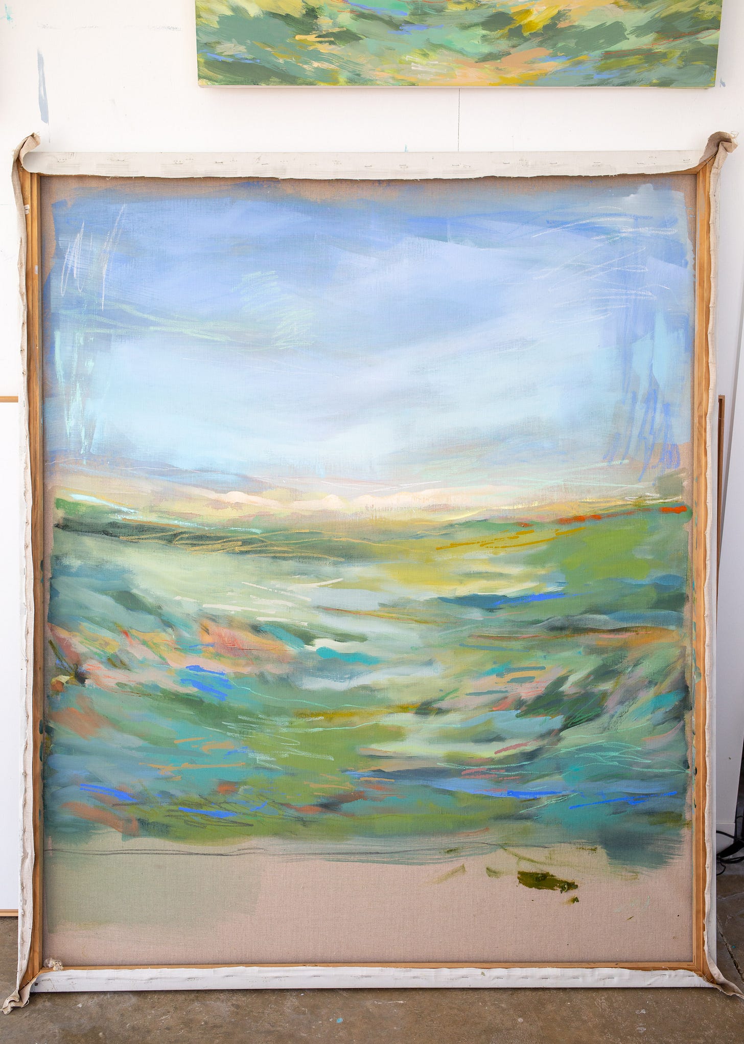 Similar to the 48x60, I just let this one ride. No plan, no sketching the composition. Just a freestyle landscape. When I started blocking in the sky color I still had some kind of beige or yellow color stuck in my brush (I’m not always the best at thoroughly rinsing my brushes as I paint) and when mixed with light blue paint, it created this warm, almost greenish-blue that felt like the sky after a storm and informed the direction of the rest of the painting. A happy accident I was glad to follow.