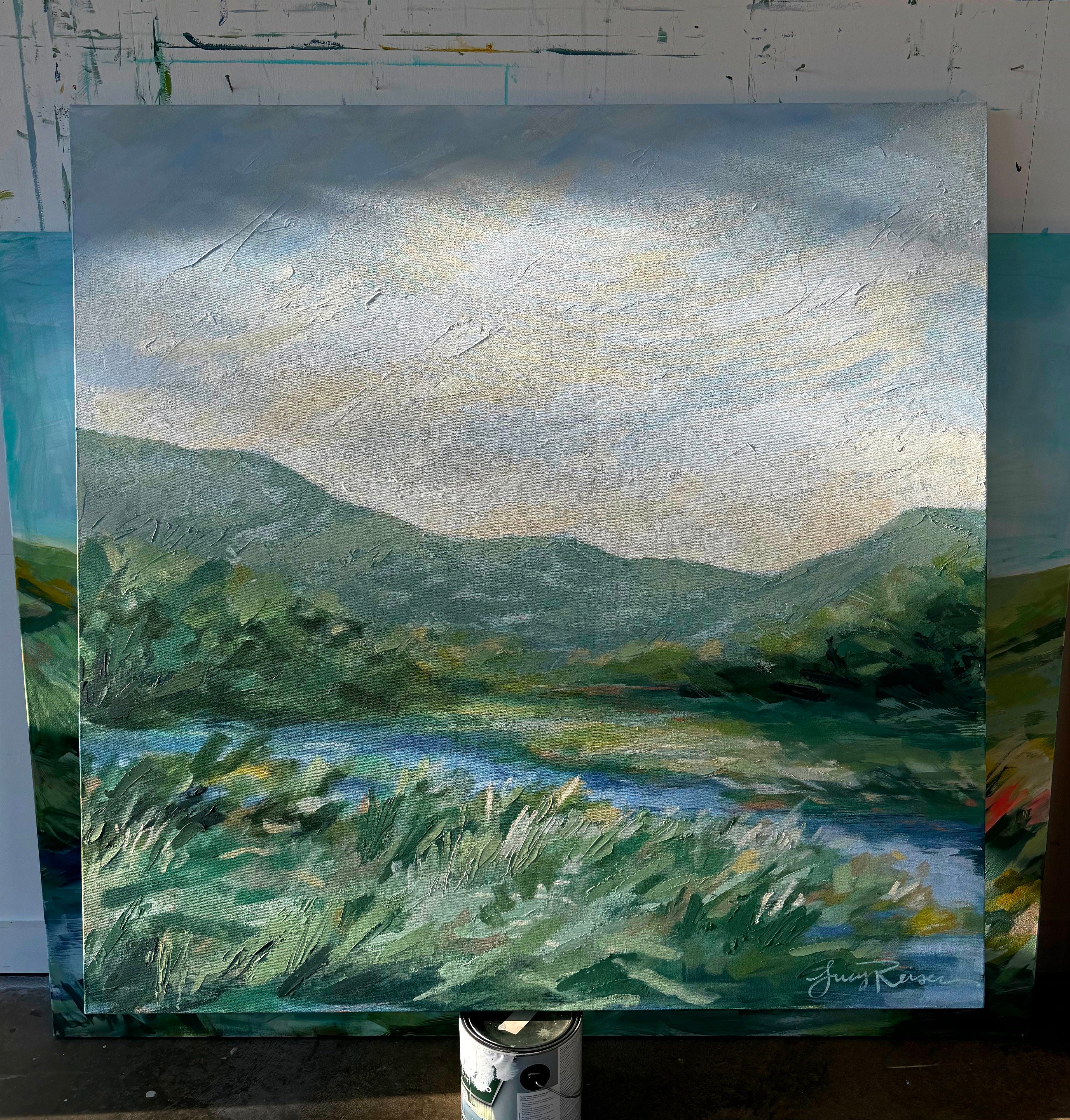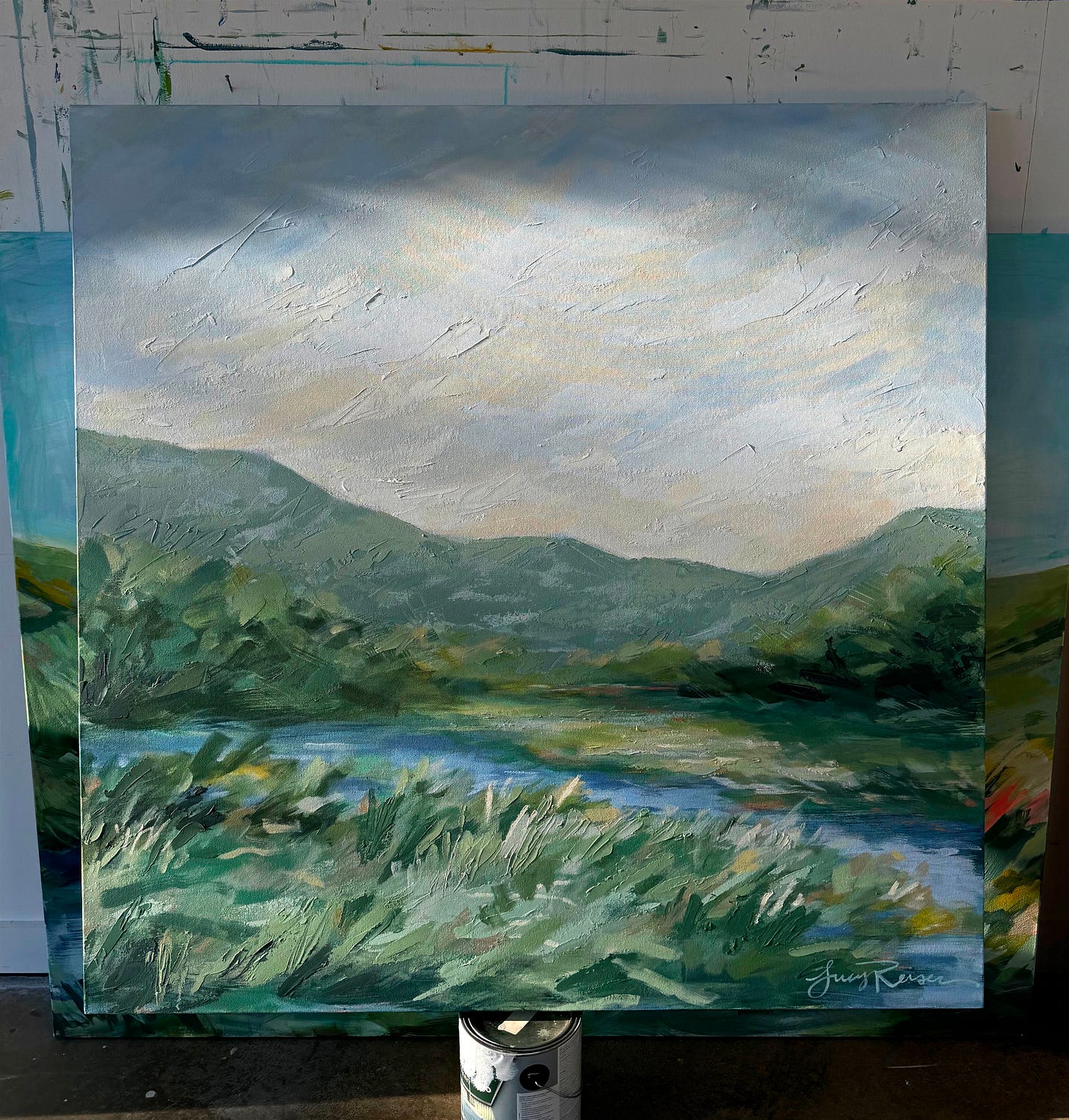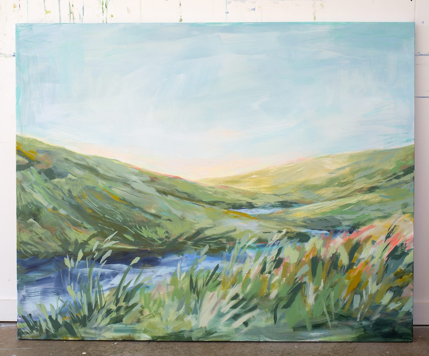 My favorite way to paint is LARGE. I prefer a canvas the size of a small adult. Thankfully 48x60” is a common size for me, and when I propped this canvas up this landscape spilled out. Last year I spent so much time on smaller still lives which was uniquely delightful and the fulfillment of a long-percolating idea. But those little paintings took a good bit of precision and attention to detail that large-scale landscapes and abstracts don’t seem to require from me, ironically. So diving back into large-scale landscape painting I let myself go in without a plan, and just paint whatever felt natural. When this happens I usually end up with a scape like this that feels equally adventurous and restful - like you could jump into the scene and either hike 10 miles or take a nap by the river. Both are my ideal scenarios.