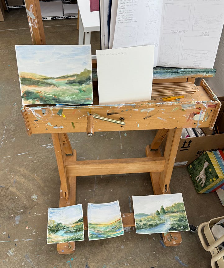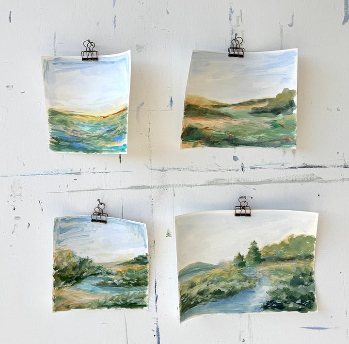 And now I’m in planning mode for a group of paintings that will go to a gallery in June. It will be a mix of landscapes and abstracts, but I wanted to get a feel for what direction I might take things. These sketches aren’t necessarily final concepts, but they are a definite starting point. I want to challenge myself to allow my landscapes to get looser, let larger blocks of color sit on the canvas without feeling like I need to add texture and detail to every part. A couple of these studies are a bit tighter and more detailed than I want the final paintings to be, so I’ll probably do another round or two of sketches (and try to loosen up!) before I move to canvas.