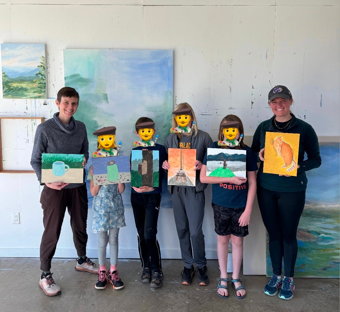Also last month I hosted a small homeschool co-op group for a morning painting session. I loved seeing what each person decided to paint and the choices they made throughout the process. I’ve noticed that kids often have much fewer inhibitions when it comes to making art - they usually seem far less concerned by doing things the “right” way, but instead easily decide what to paint, grab the colors they like best and dive right in. Broom with a fiery orange background?? Yes, please! It’s a good reminder to not take it too seriously and just have fun painting. (I always feel hesitant to post kid faces on the internet so artist emojis it is!)