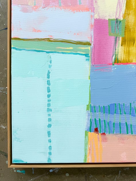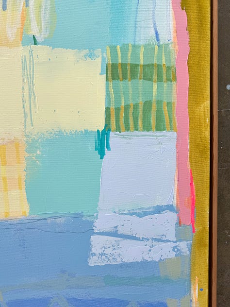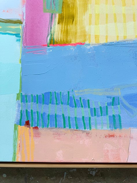 And finally, I’m making progress on this 36x36” commission. The clients purchased a river painting I did several years ago and reached out to commission a complementary landscape painting in the same size and colors to flank an archway in their foyer. The older river painting was done in an abstract, piecey style that I haven’t used quite as much recently, so I’m referencing it a good bit to make sure the new painting feels fitting. They requested the landscape have a composition similar to an older painting from Switzerland, so I’m essentially recreating that scene in the colors and painting style of the river painting they already own. I’d say this one is about 60-70% finished…
